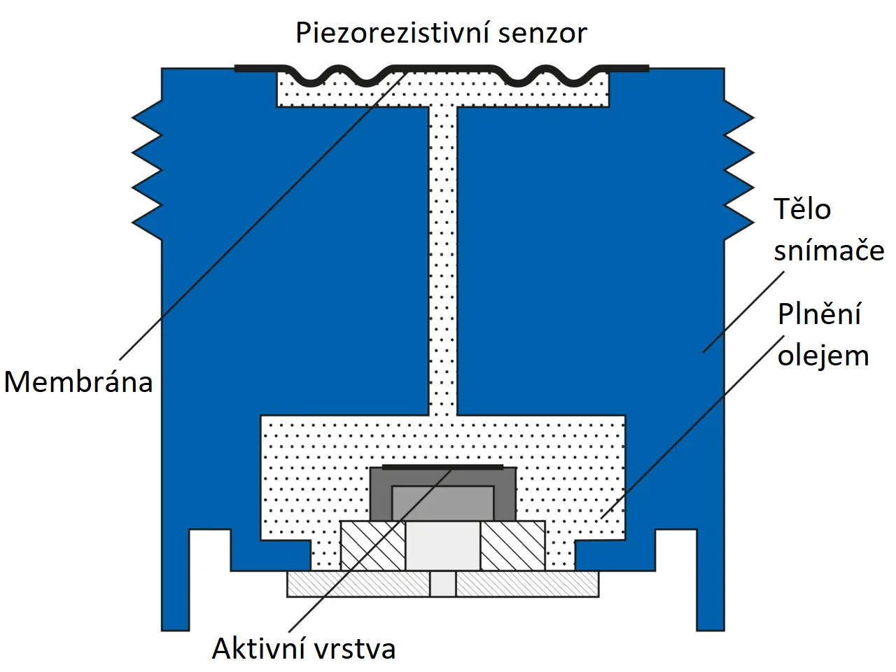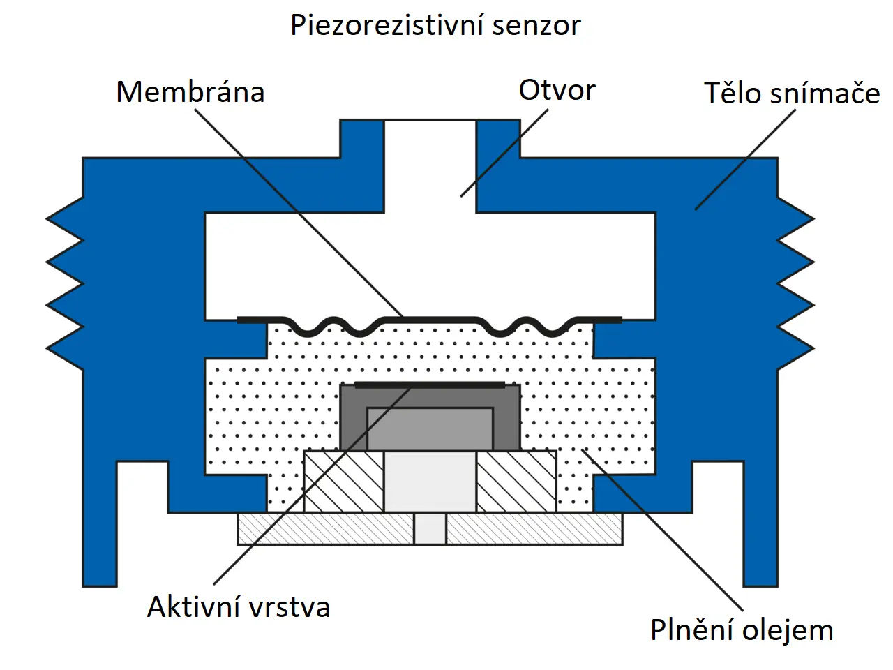 U polovodičových materiálů je změna měrného odporu a tím i signálu výsledkem proměnlivé pohyblivosti elektronů v krystalické struktuře. Tato pohyblivost je ovlivněna mechanickým zatížením. Křemíkový čip a procesní médium jsou odděleny membránou z nerezové oceli. Membrána může být umístěná vně nebo uvnitř snímače tlaku. V závislosti na aplikaci se jako převodová kapalina pro přenos vnitřního tlaku používá parafín nebo silikonový olej. Snímače tlaku s piezorezistivním křemíkovým tlakovým čidlem vynikají vysokou přesností měření a dlouhodobou stabilitou. Ve styku s měřeným médiem je pouze nerezová ocel.